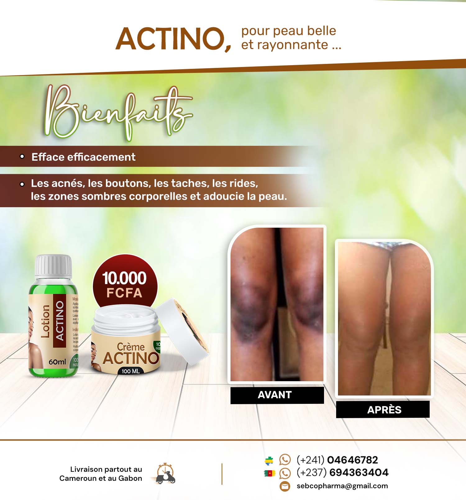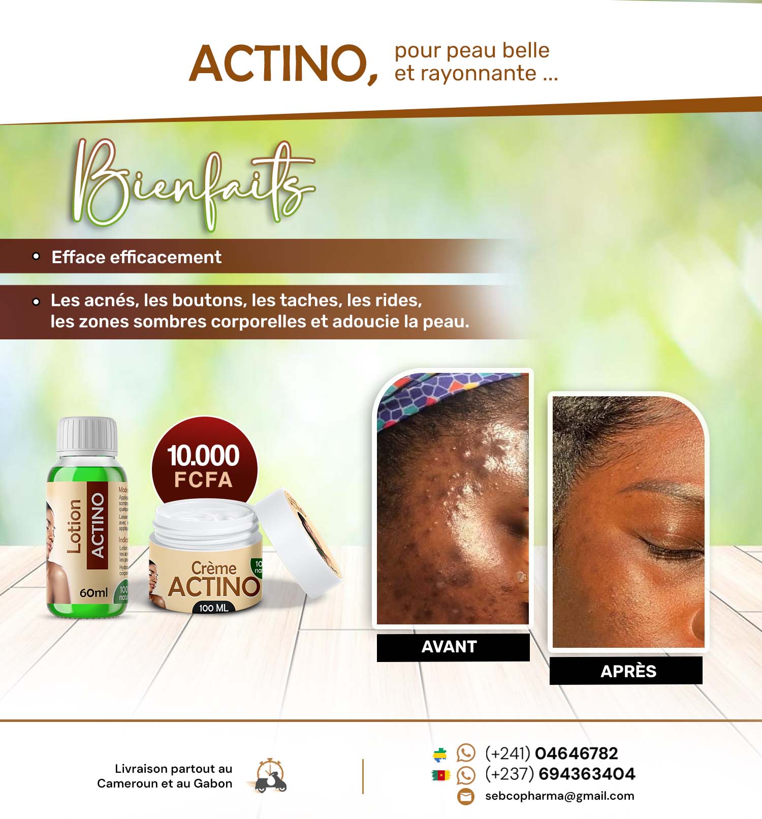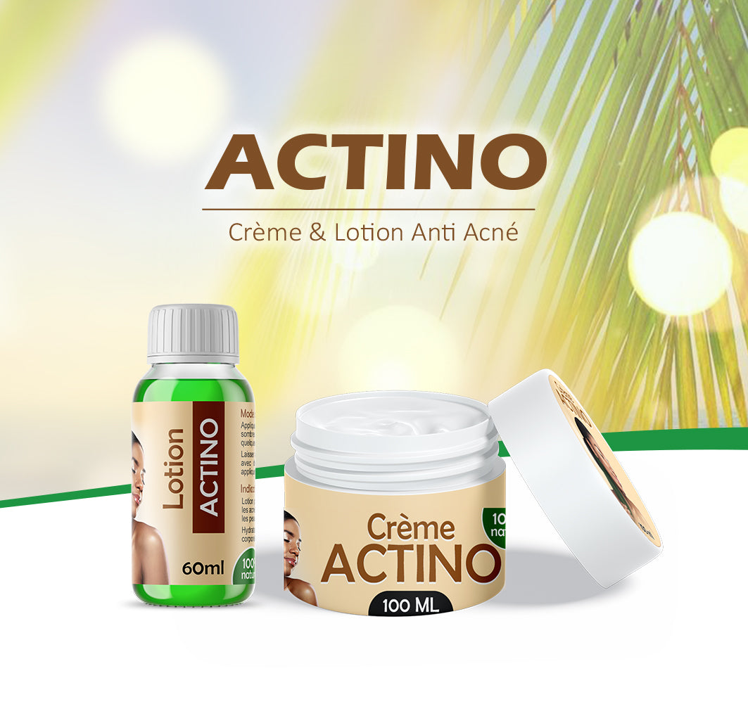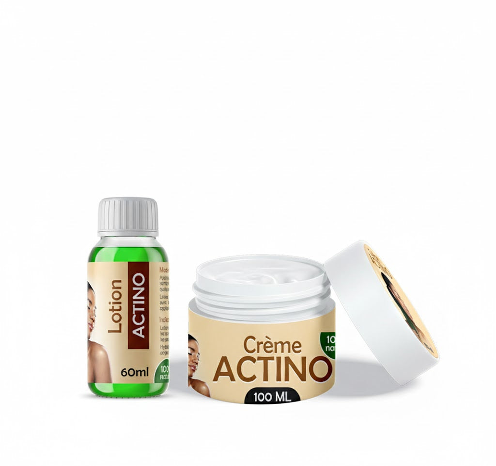 La crème et lotion ACTINO sont des produits 100% naturels composés respectivement de beurre de cacao, de citron , essence de carotte et plusieurs fruits, vitamine E et d’acide kojique.