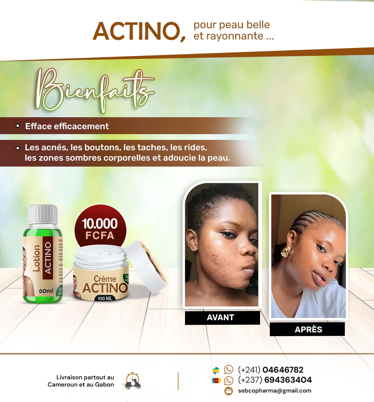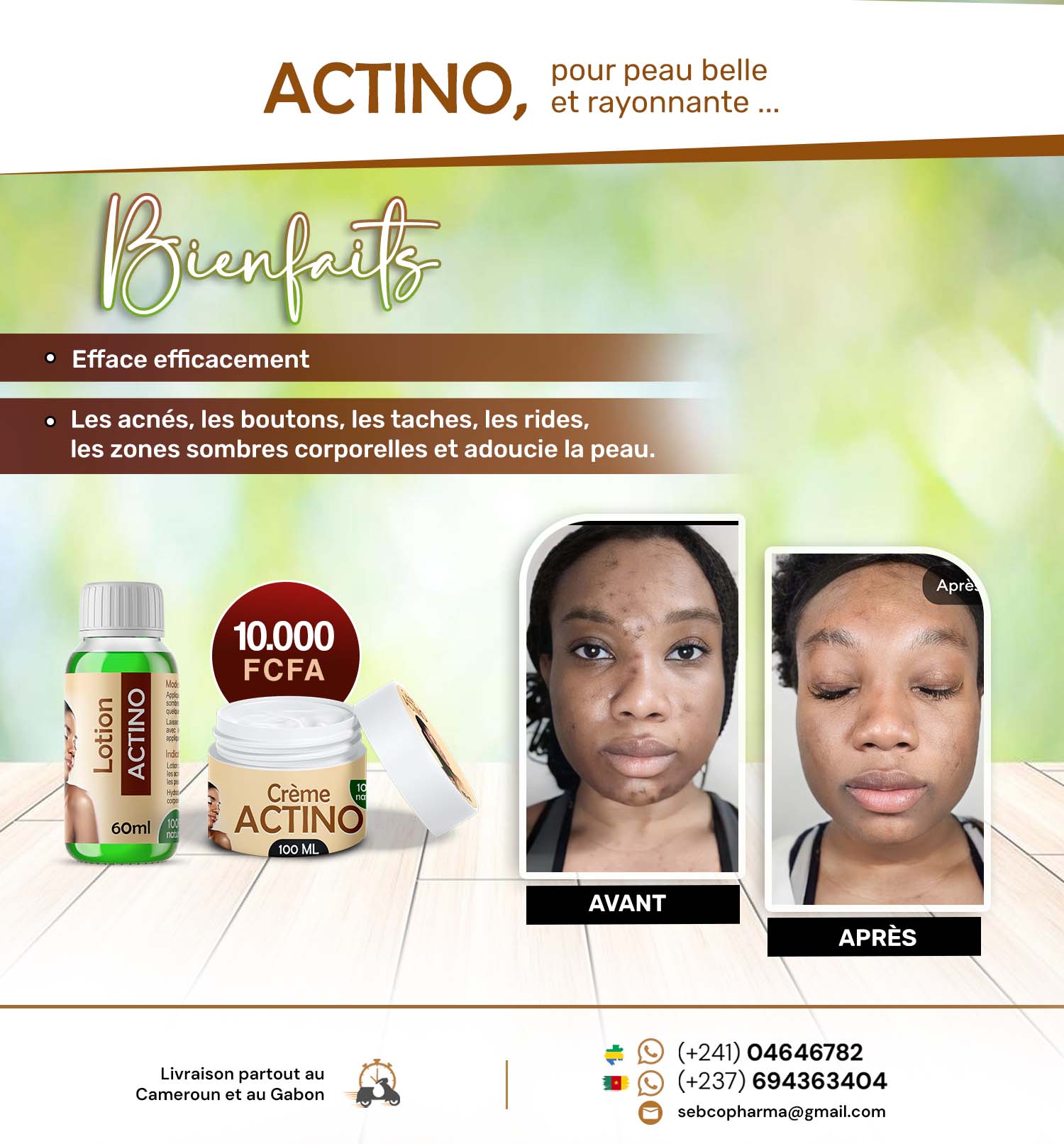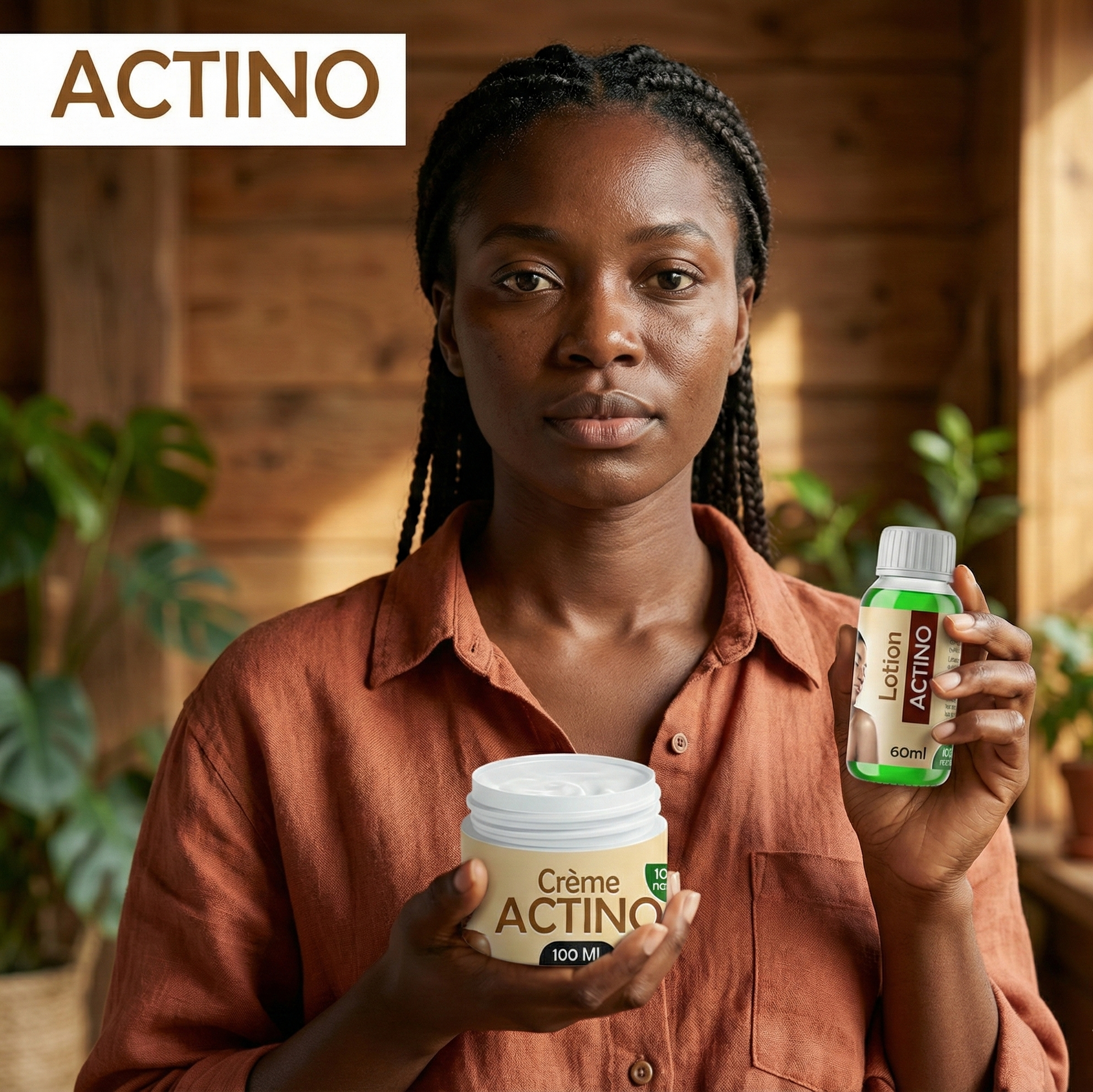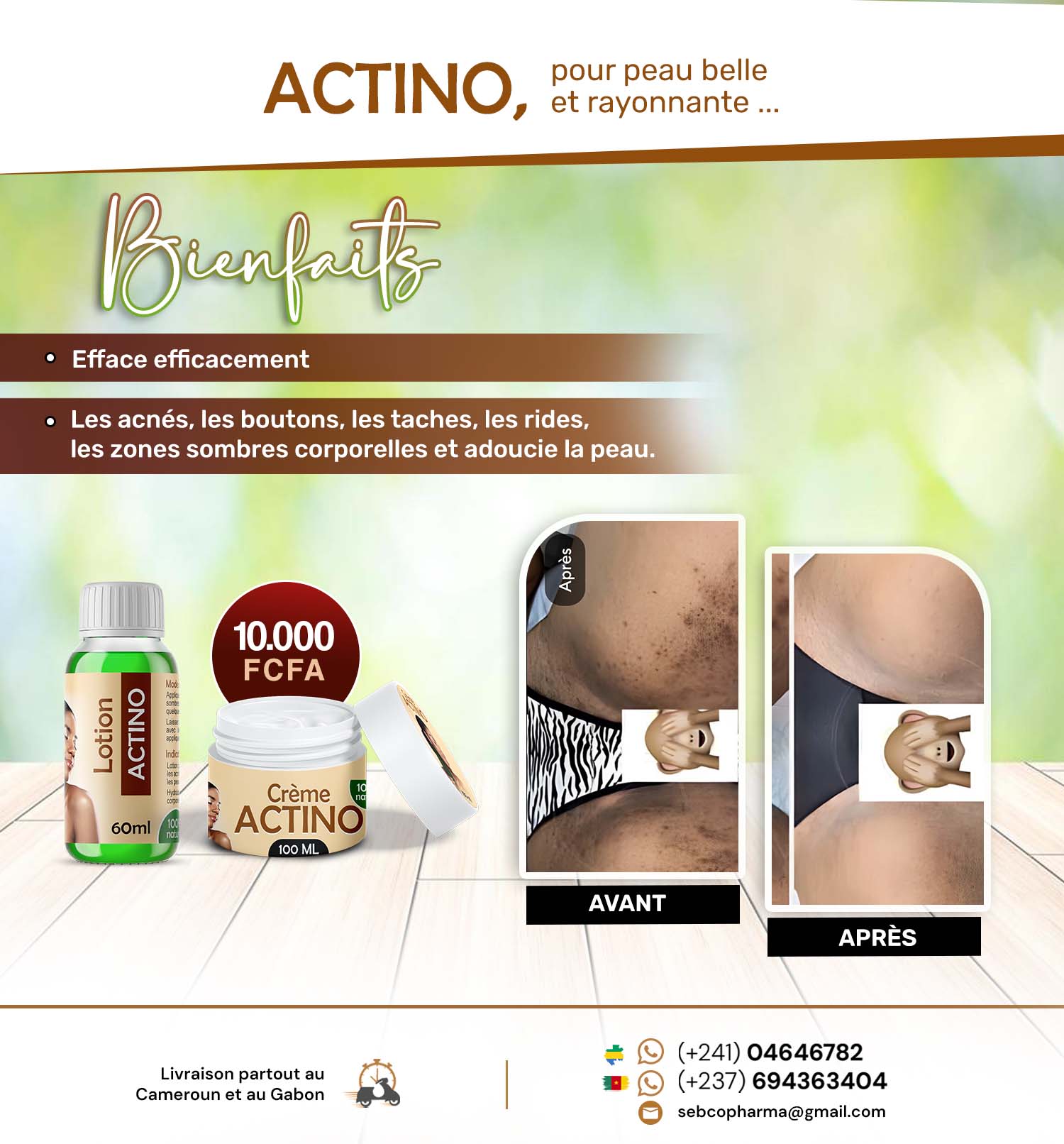 La crème et lotion ACTINO sont des produits 100% naturels composés respectivement de beurre de cacao, de citron , essence de carotte et plusieurs fruits, vitamine E et d’acide kojique.