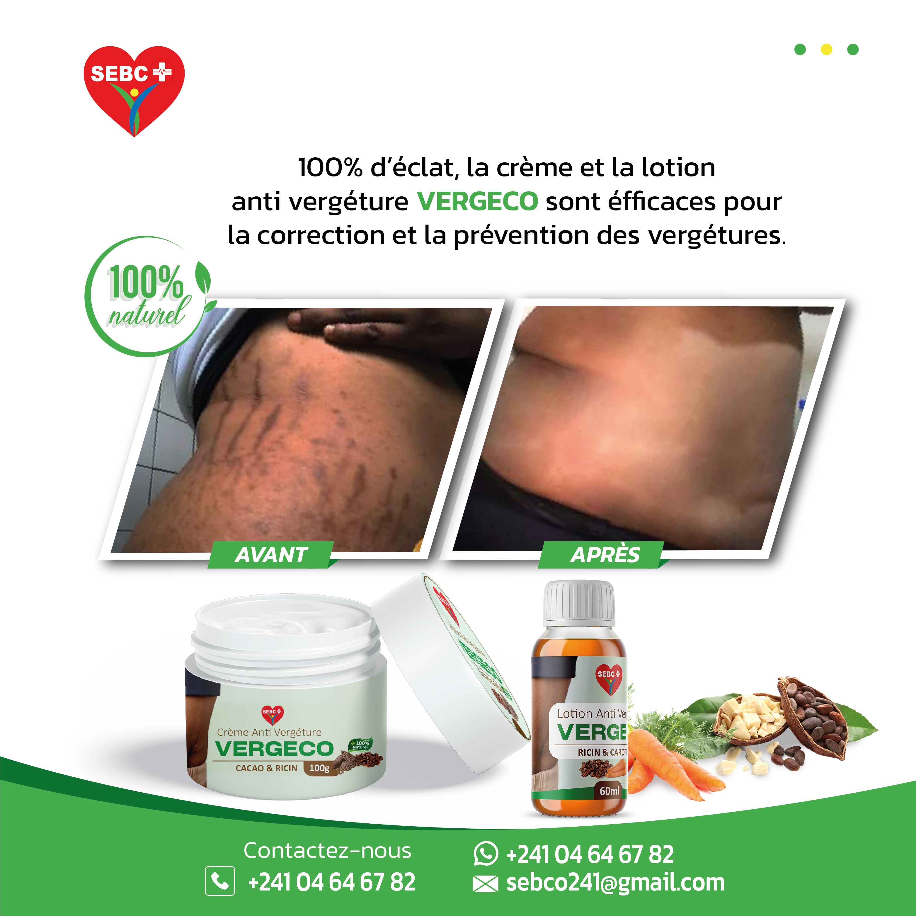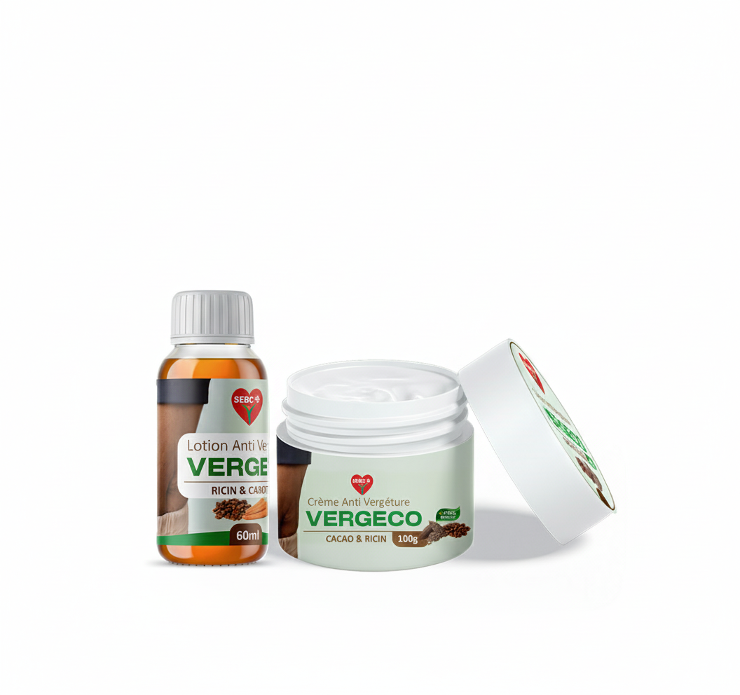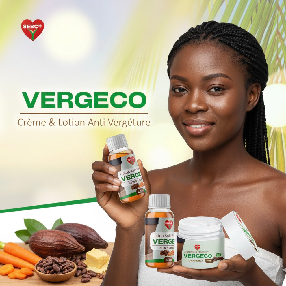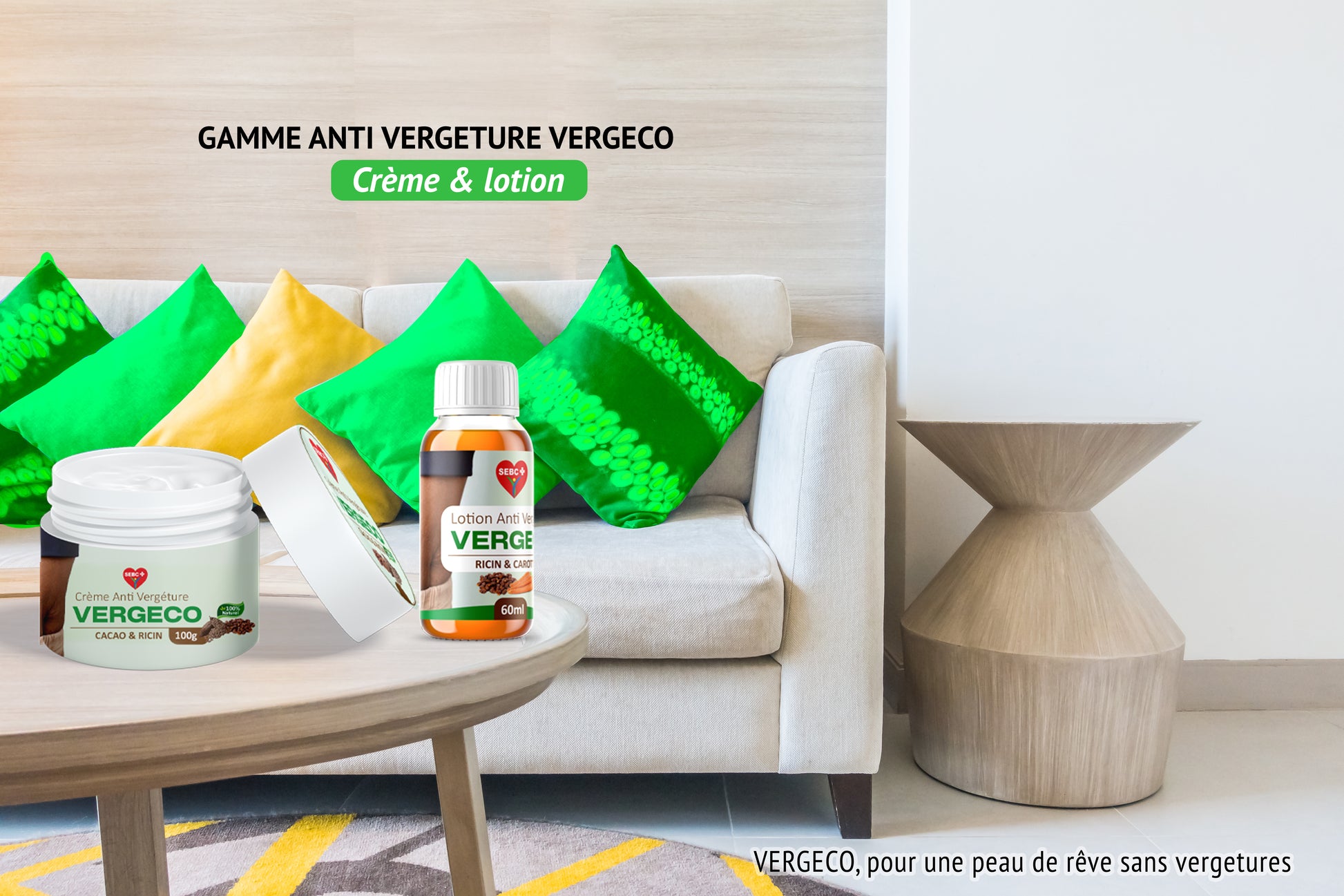 Crème et lotion Anti Vergeture VERGECO sont des produits 100% naturels composés respectivement de cacao, de ricin , essence de carotte, vitamine E et d’acide kojique.