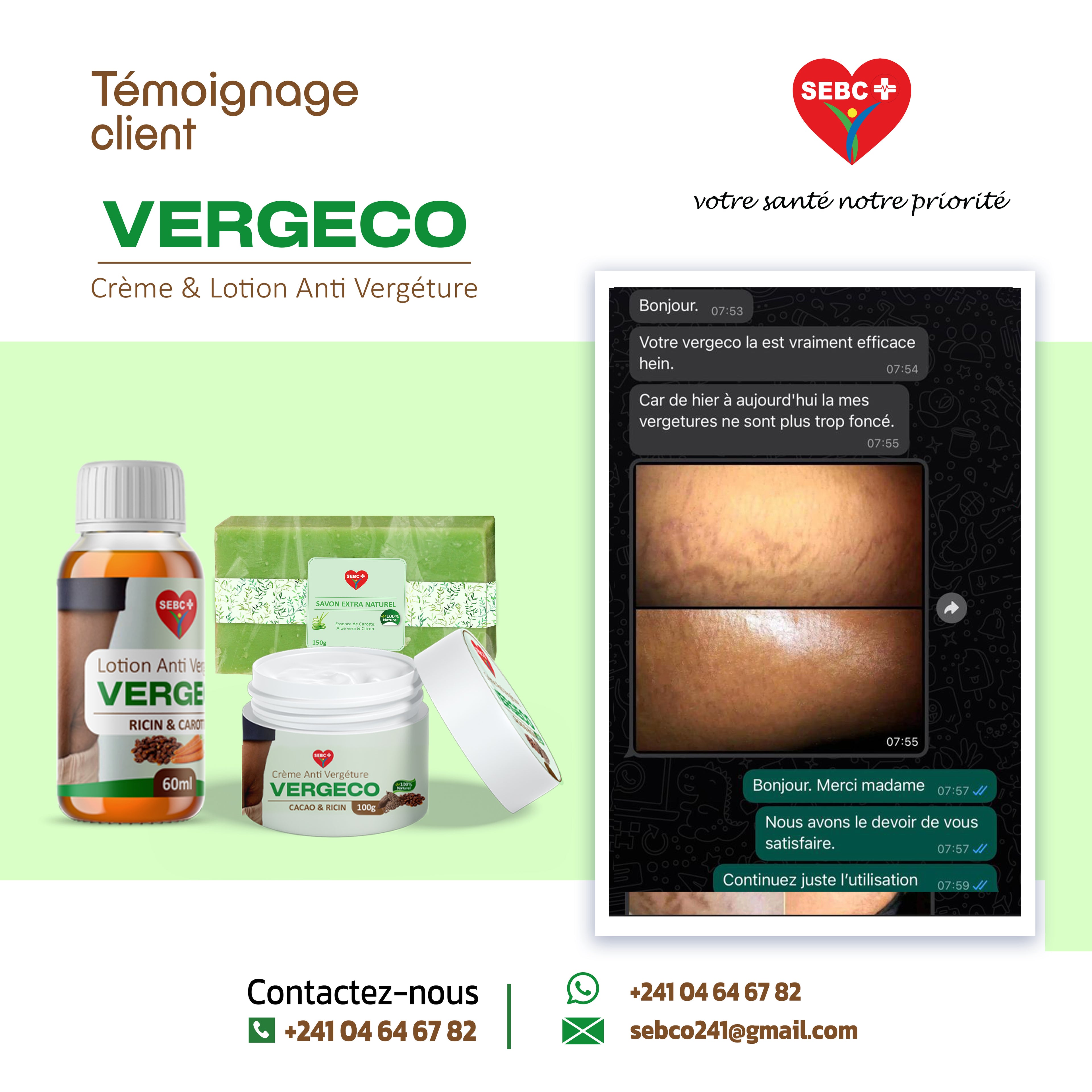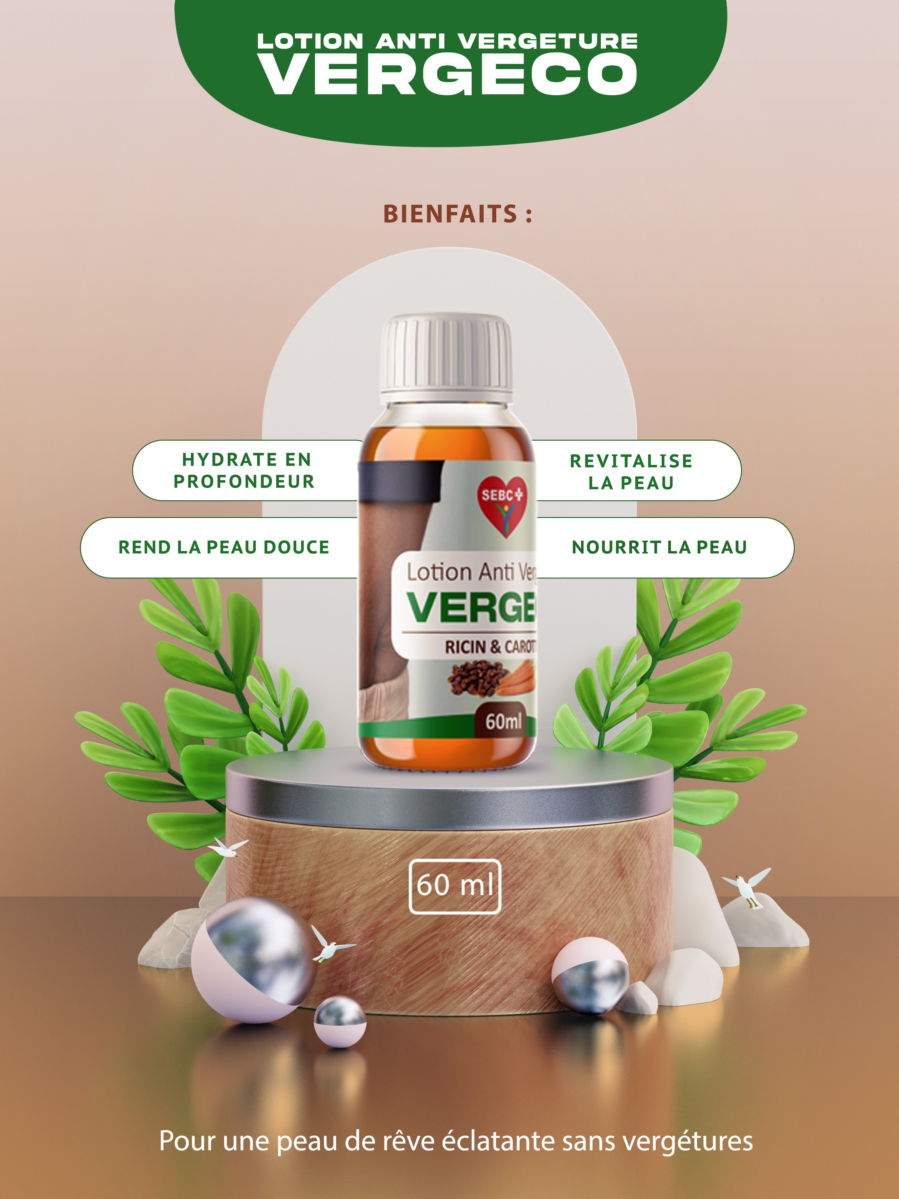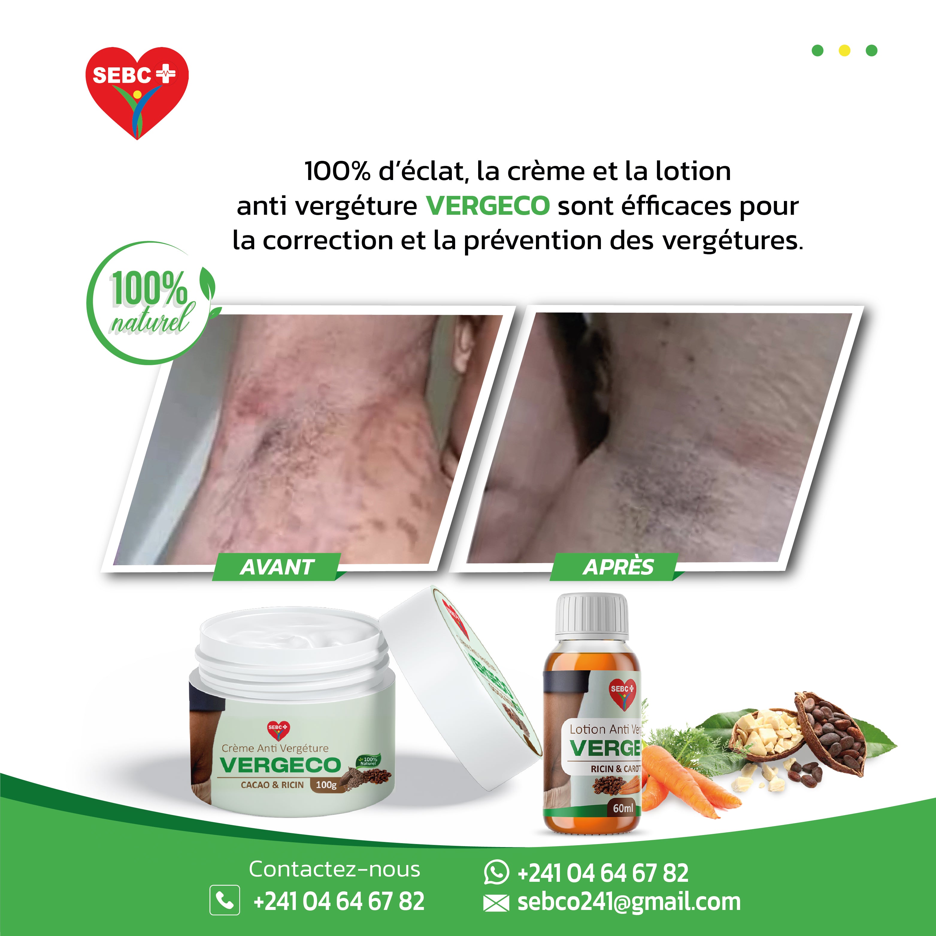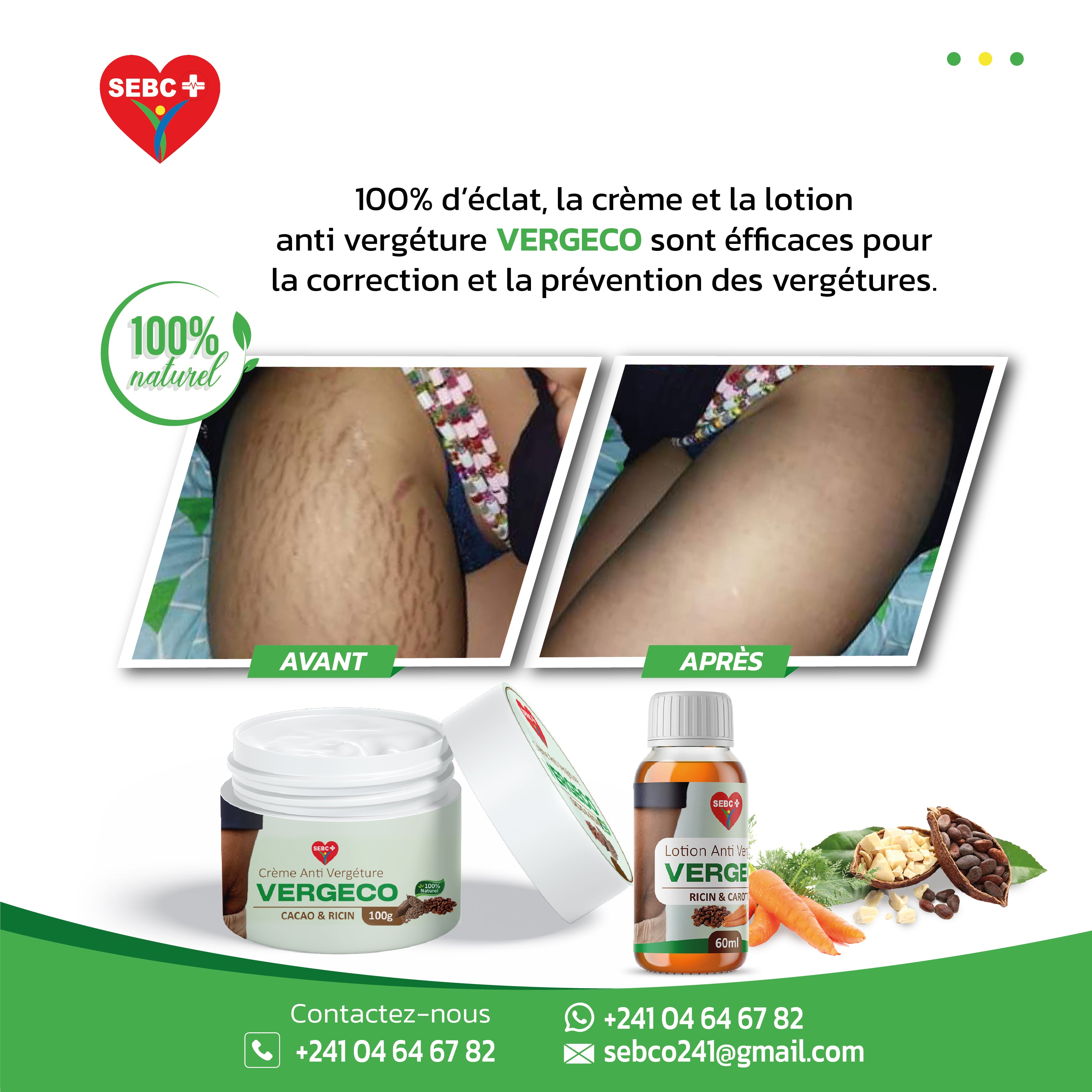 Crème et lotion Anti Vergeture VERGECO sont des produits 100% naturels composés respectivement de cacao, de ricin , essence de carotte, vitamine E et d’acide kojique.