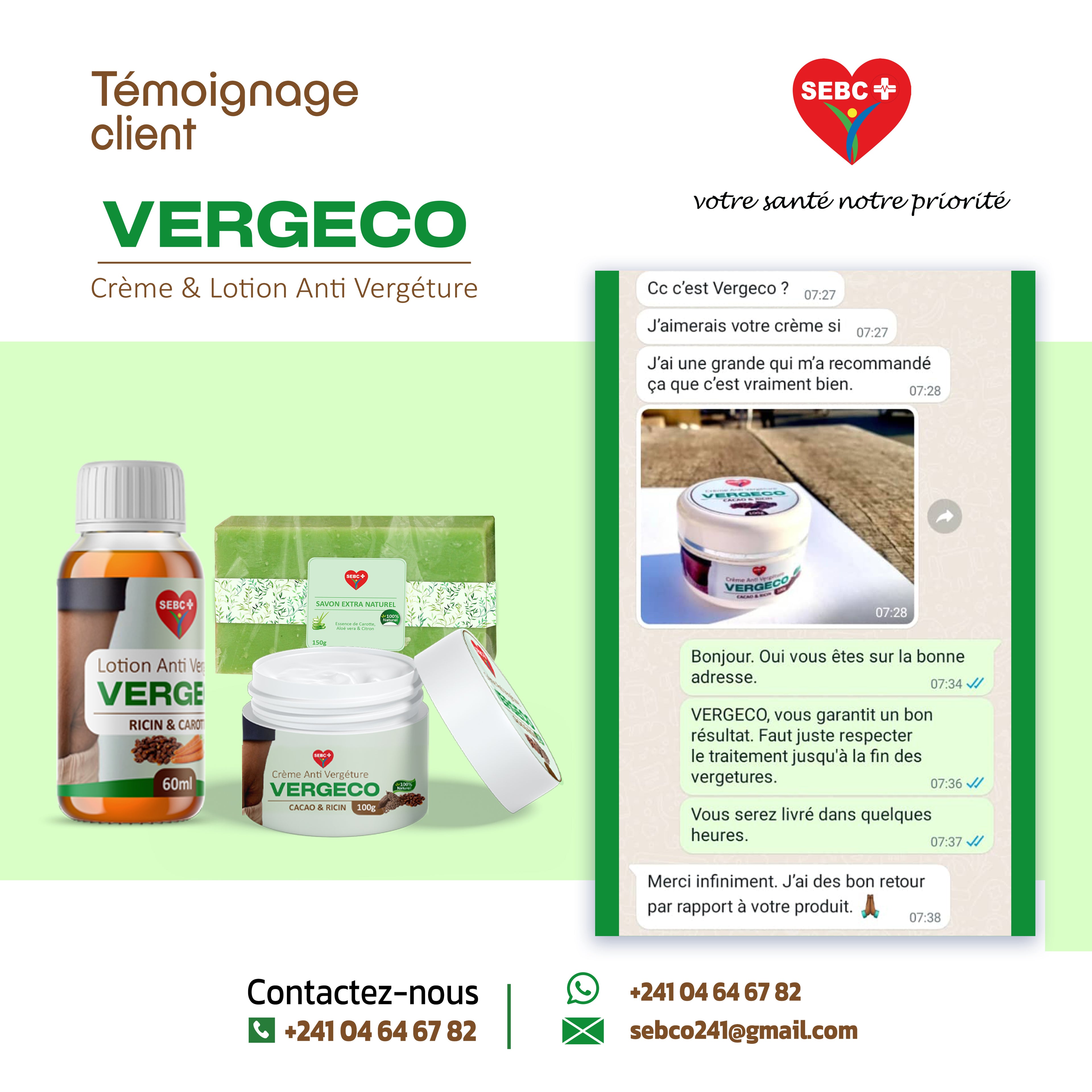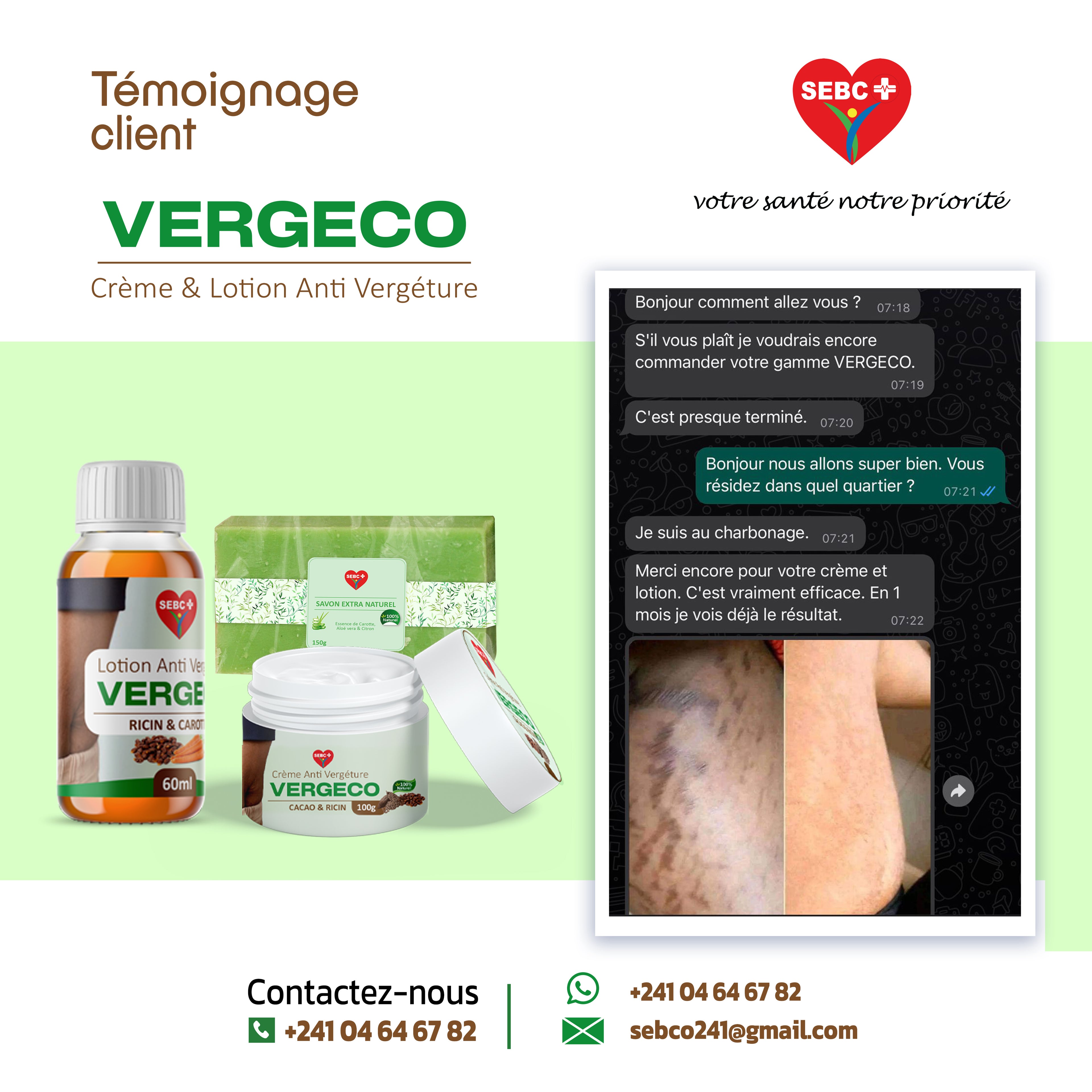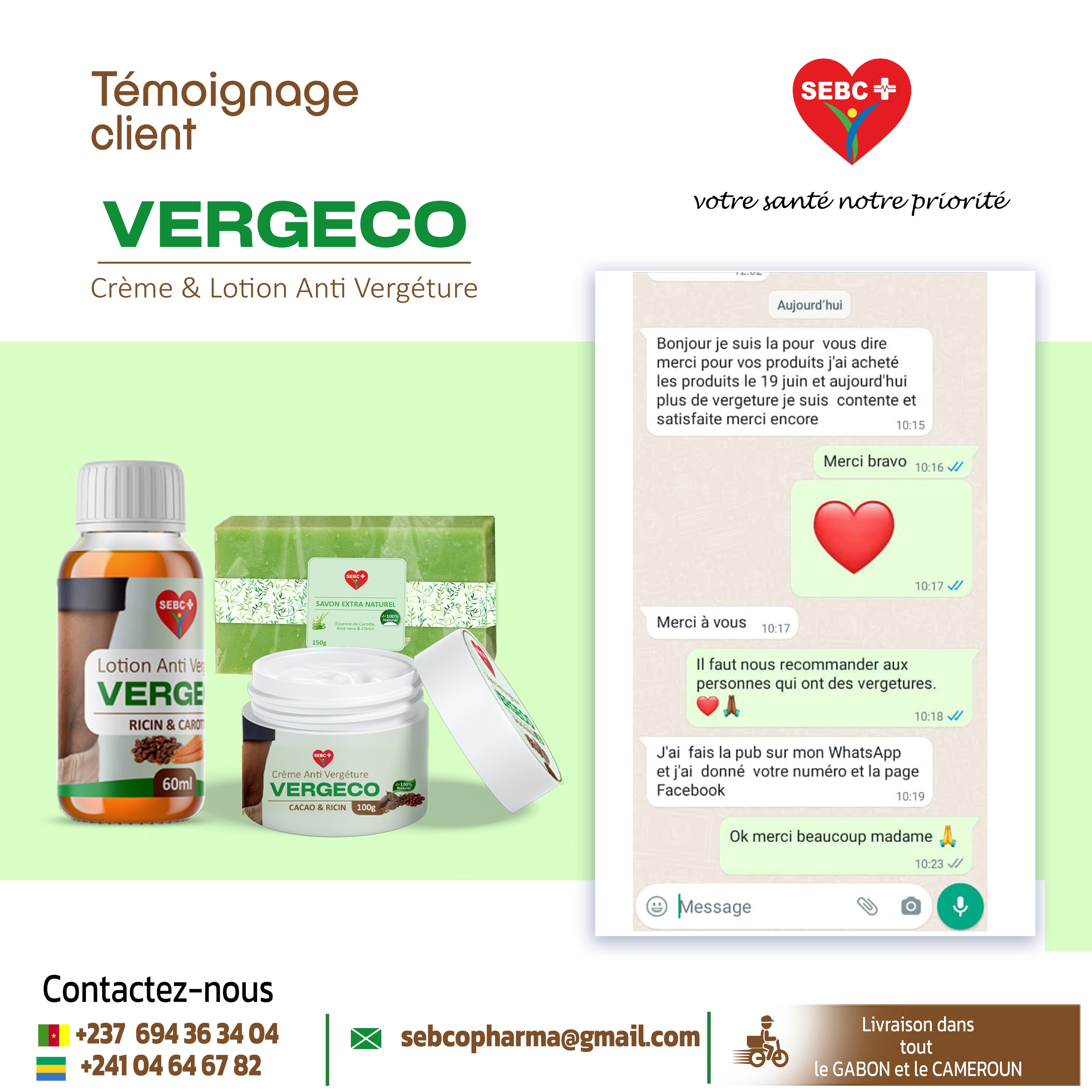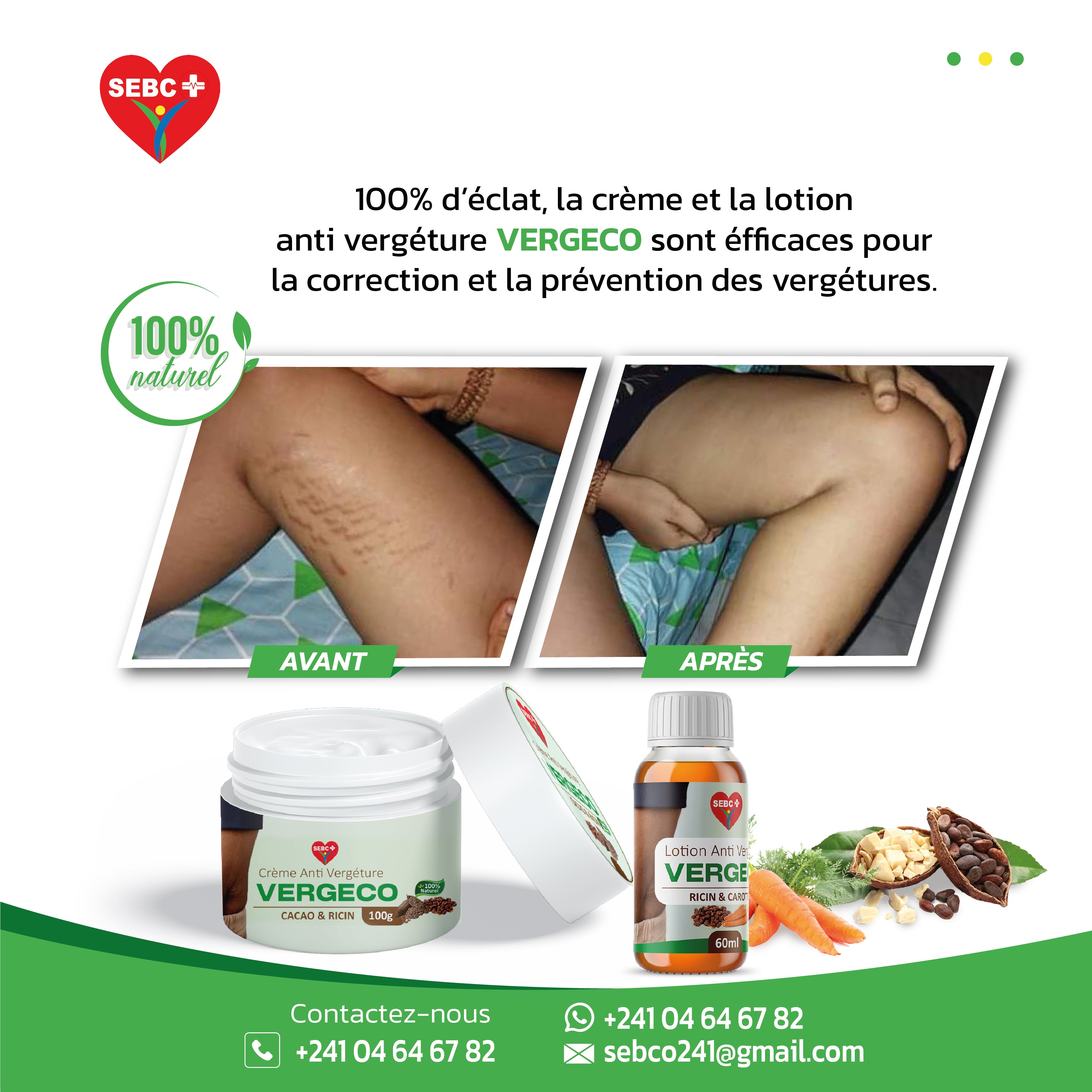 Crème et lotion Anti Vergeture VERGECO sont des produits 100% naturels composés respectivement de cacao, de ricin , essence de carotte, vitamine E et d’acide kojique.